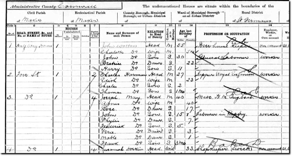 ADDED APRIL 2018 1911 Census Transcription for Maker, Rame and Millbrook. (see below)